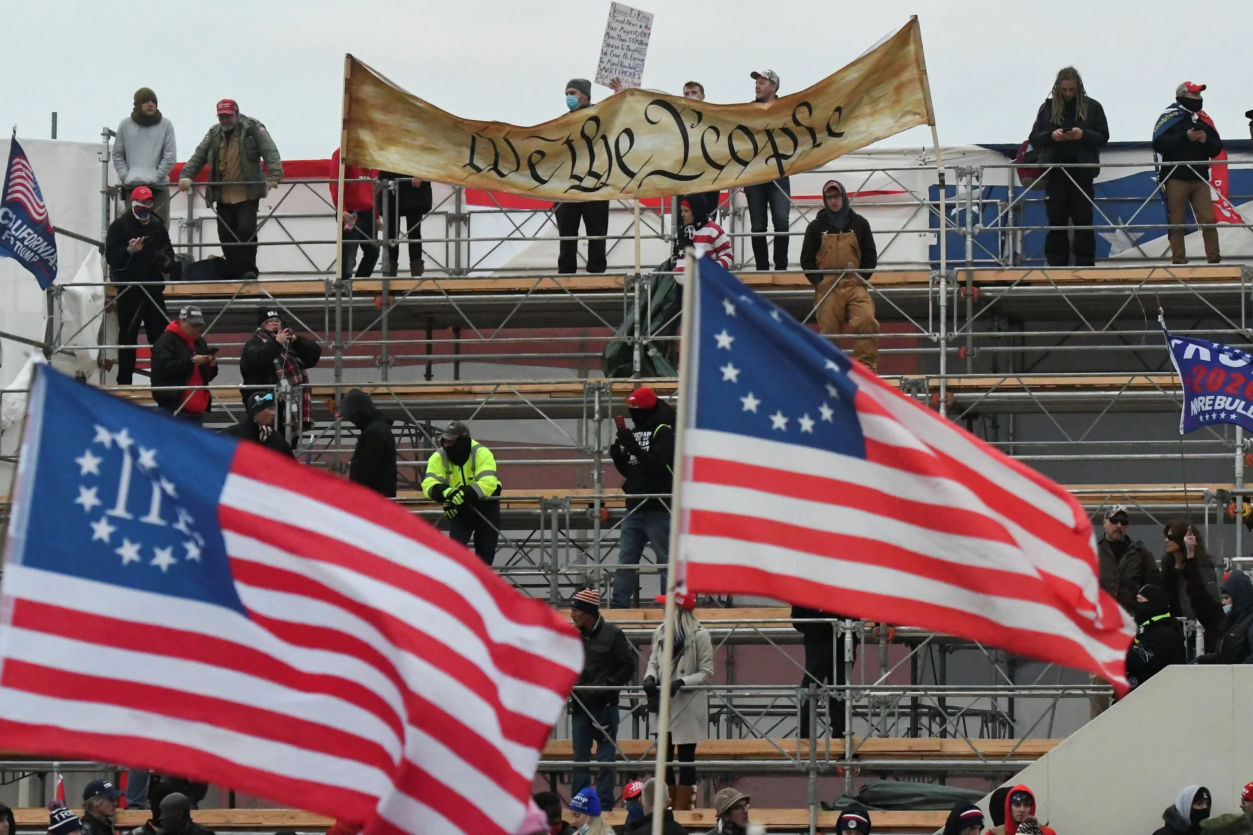 Supporters of U.S. President Donald Trump hold a "We the People" banner, a Three Percenters flag and a 13-star Betsy Ross U.S. flag, gather in front of the U.S. Capitol Building in Washington, U.S. January 6, 2021. REUTERS/Stephanie Keith